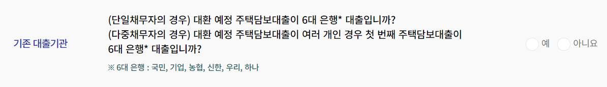 기존 대출이 6대은행 대출이라면 해당 은행에 방문하여 신청하면 되고, 그 외의 대출은 한국주택금융공사에서 신청하면 됩니다.
