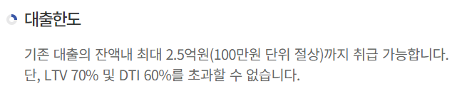 다만 LTV 70%, DTI 60%를 초과하여 한도를 부여받을 수 없으니 유의바랍니다.