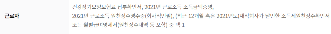 근로자 및 사업자, 연금소득자는 소득을 증빙할 수 있는 서류를 구비하여 신청할 수 있습니다.