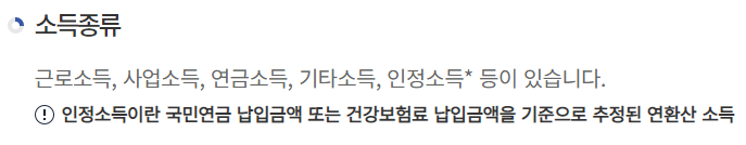 인정받을 수 있는 소득의 종류에는 근로소득, 사업소득, 연금소득, 기타소득, 인정소득 등이 있으니 참고바랍니다.