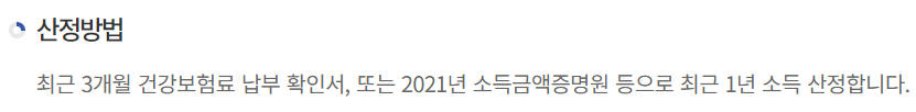 소득을 산정하는 방법은 최근 3개월 건강보험료 납부확인서 또는 2021년 소득금액증명원 등으로 최근 1년 소득을 산정합니다.