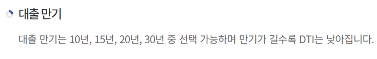 안심전환대출의 대출상환기간은 10년, 15년, 20년, 30년 중 신청인이 선택해서 약정가능하며 만기가 길수록 DTI가 낮아지게 됩니다.