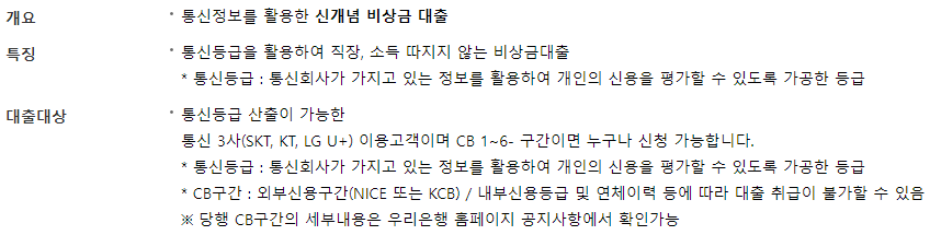 우리은행 비상금 대출은 통신등급 산충이 가능한 통신3사(SKT, KT, LGU+)를 이용하고 있으면서 신용등급이 1~6등급 이내면 누가누 신청할 수 있습니다.