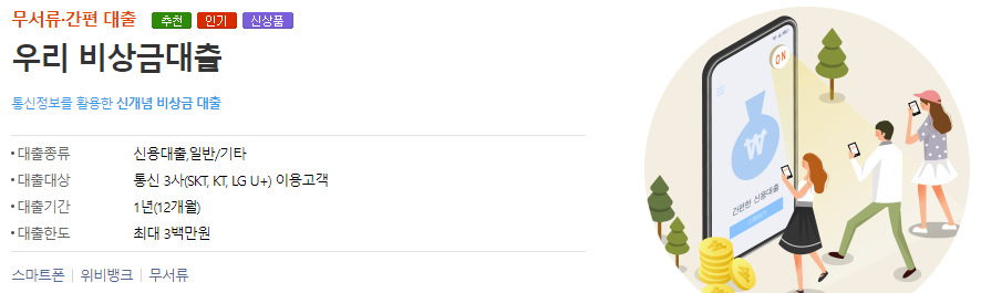 우리은행 비상금대출은 통신정보를 활용한 신개념 비상금 대출 상품입니다.