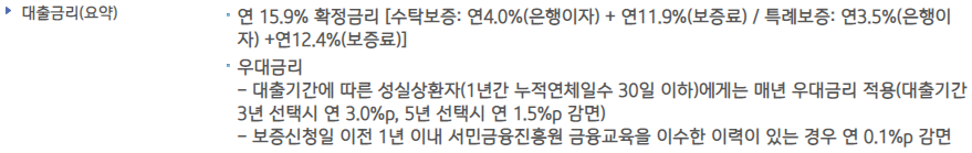 기업은행 햇살론15의 금리는 연 15.9%의 단일금리가 적용되며, 연 4.0%~4.5%는 은행이 수취하는 금리이며, 나머지는 국민행보긱금 보증료율로 수취됩니다.