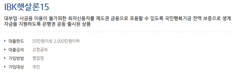 기업은행 햇살론15는 고금리 대출을 이용할 수 밖에 없는 분들을 지원하기 위한 정부정책 서민금융 상품입니다.