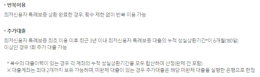 또한 최초 이용 후 최근 3년이내 최저신용자 특례보증 대출의 누적 성실상환기간이 6개월 이상인 경우 1회 추가 대출이 가능합니다.