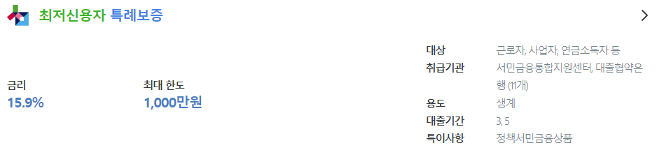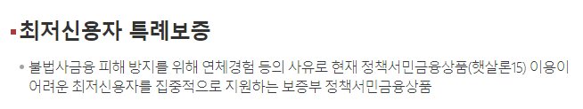 최저신용자 특례보증은 햇살론15를 신청하였지만 거절된 최저신용자 중에서도 최저신용자분을 지원하기 위해 만든 정부지원 서민대출 상품입니다.