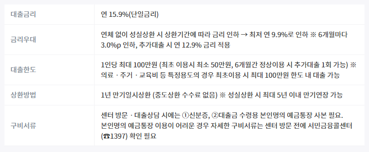 대출금리는 햇살론15와 동일하게 연 15.9%의 단일 금리가 적용됩니다.