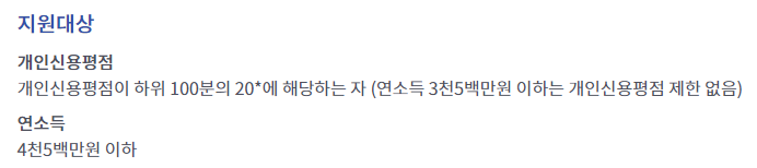 ▶개인신용평점 : 개인신용평점이 하위 20%에 해당하는 분, 연소득 3500만원 이하인 분은 개인신용평점이 높아도 신청이 가능합니다.