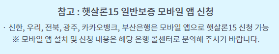 신한은행, 우리은행, 전북은행, 광주은행, 카카오뱅크, 부산은행의 모바일 앱을 통해 은행방문없이 햇살론15 신청이 가능하니 참고하시길 바랍니다.