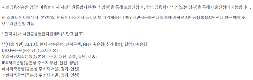 최저신용자 특례보증 약정을 체결한 이후 본인의 주소지와 맞는 은행에서 대출을 실행할 수 있으니 이용에 참고하시길 바랍니다.