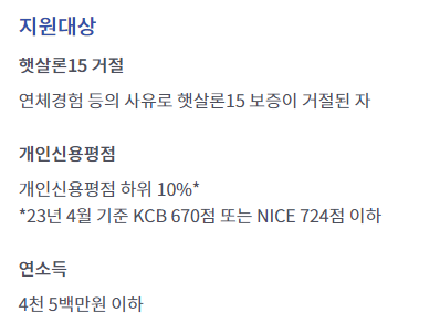최저신용자 특례보증 대출은 연체 등의 이유로 햇살론15 보증이 거절된 분이 아래의 요건을 충족하는 경우 대출신청이 가능합니다.