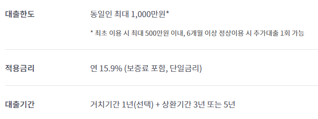 최초 이용시 최대 500만원 이내로 대출금이 산정되며, 대출 실행 후 6개월간 성실시 상환하는 경우 1회에 한해 500만원의 추가 대출을 받을 수 있습니다.